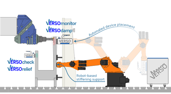 • A robot is used to assist the VERSO device by supporting specific areas of very slender workpieces which cannot be completely dampened by the VERSO actuator.